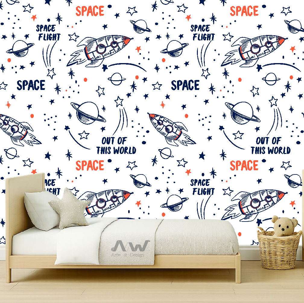 Papel de Parede Adesivo - Espaço com foguetes, planetas e estrelas