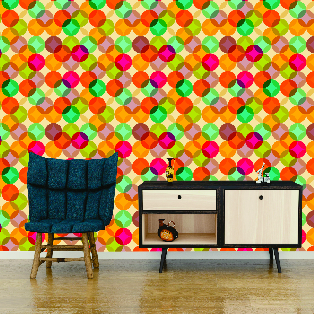 Papel de parede - Geométrico com circulos coloridos sobrepostos, formando ao centro de cada um, uma estrela de 4 pontas