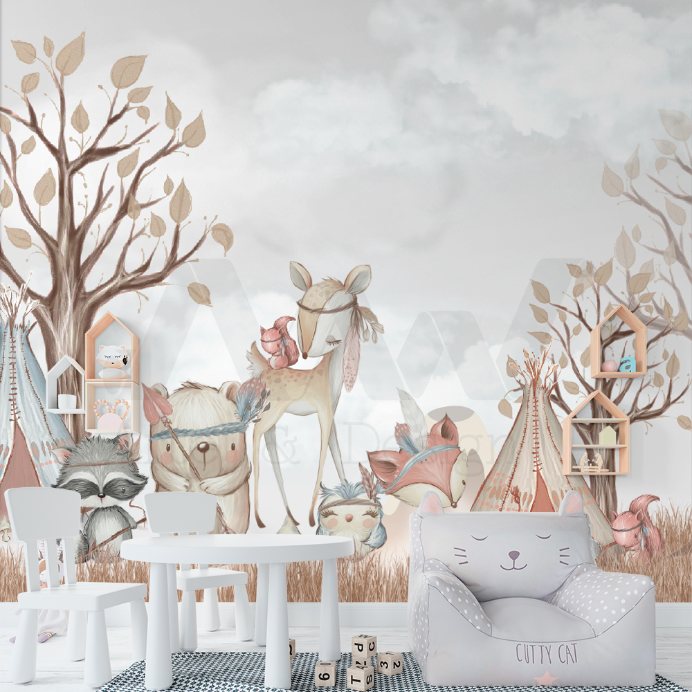 Papel de parede - Safari animais vestidos de indios com cabanas e arvores de galhos secos